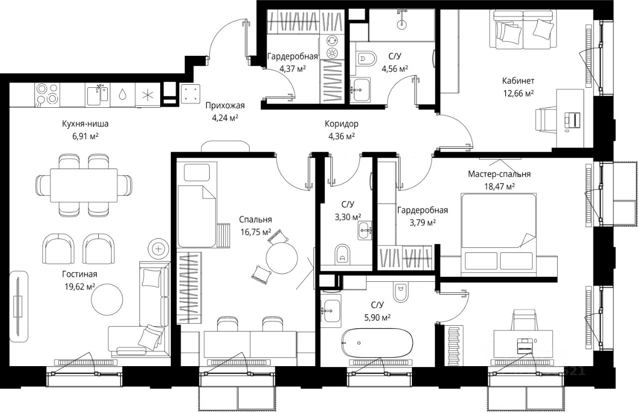 Продаётся 3-комнатная квартира общей площадью 104.93 м² без отделки в премиальном жилом комплексе "МЫС" на 5-м этаже 12 этажного дома. Квартира расположена в корпусе "Волга".