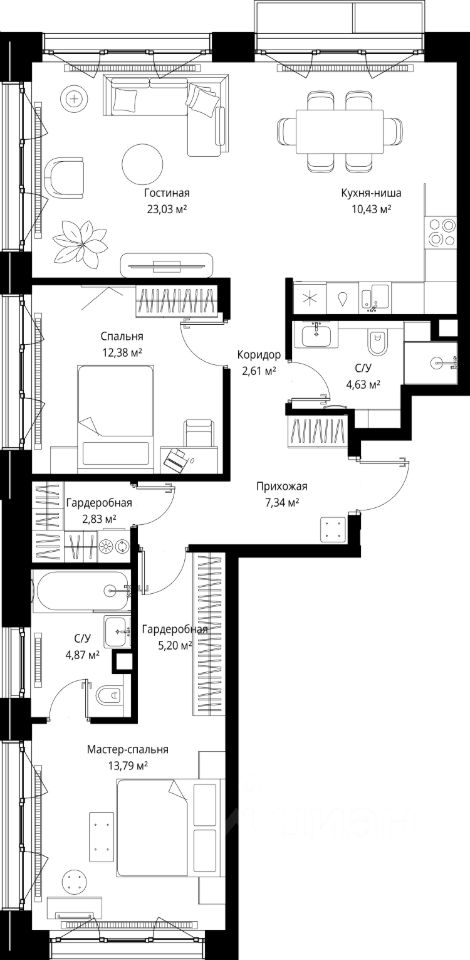 Продаётся 2-комнатная квартира общей площадью 87.11 м² без отделки в премиальном жилом комплексе "МЫС" на 2-м этаже 12 этажного дома. Квартира расположена в корпусе "Волга".