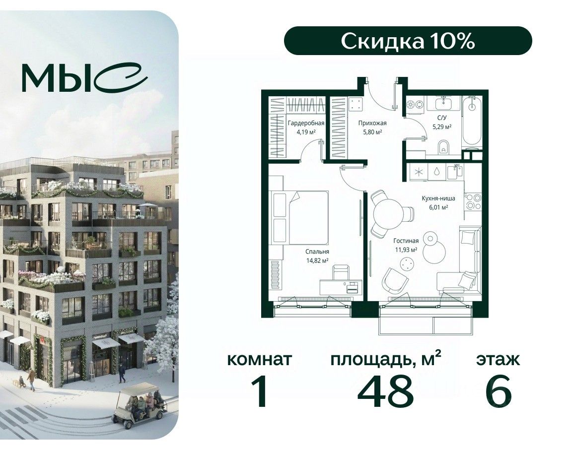 Продаётся 1-комнатная квартира общей площадью 48.04 м² без отделки в премиальном жилом комплексе "МЫС" на 6-м этаже 12 этажного дома. Квартира расположена в корпусе "Волга".