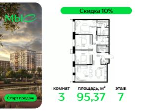 Продаётся 3-комнатная квартира общей площадью 95.37 м² без отделки в премиальном жилом комплексе "МЫС" на 7-м этаже 12 этажного дома. Квартира расположена в корпусе "Волга".