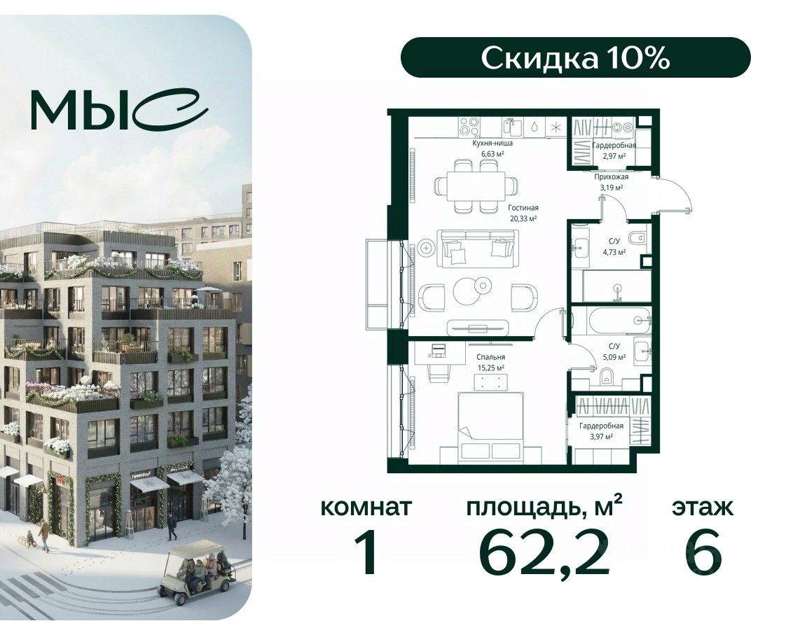 Продаётся 1-комнатная квартира общей площадью 62.16 м² без отделки в премиальном жилом комплексе "МЫС" на 6-м этаже 12 этажного дома. Квартира расположена в корпусе "Волга".