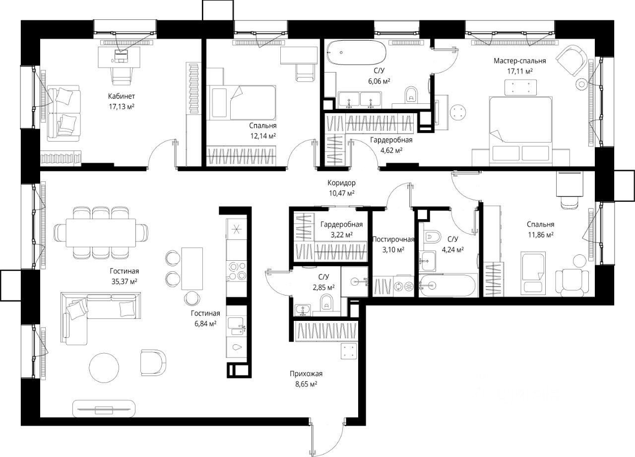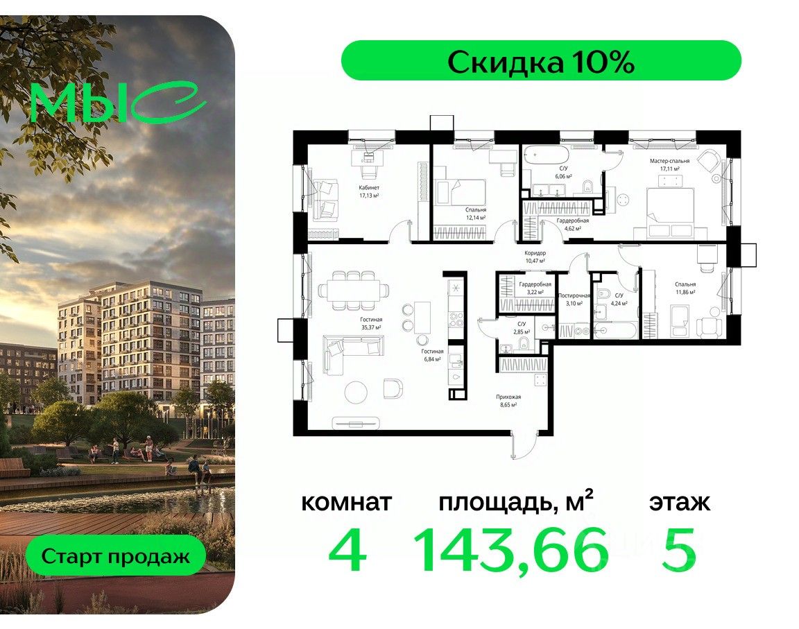 Продаётся 4-комнатная квартира общей площадью 143.66 м² без отделки в премиальном жилом комплексе "МЫС" на 5-м этаже 12 этажного дома. Квартира расположена в корпусе "Волга".