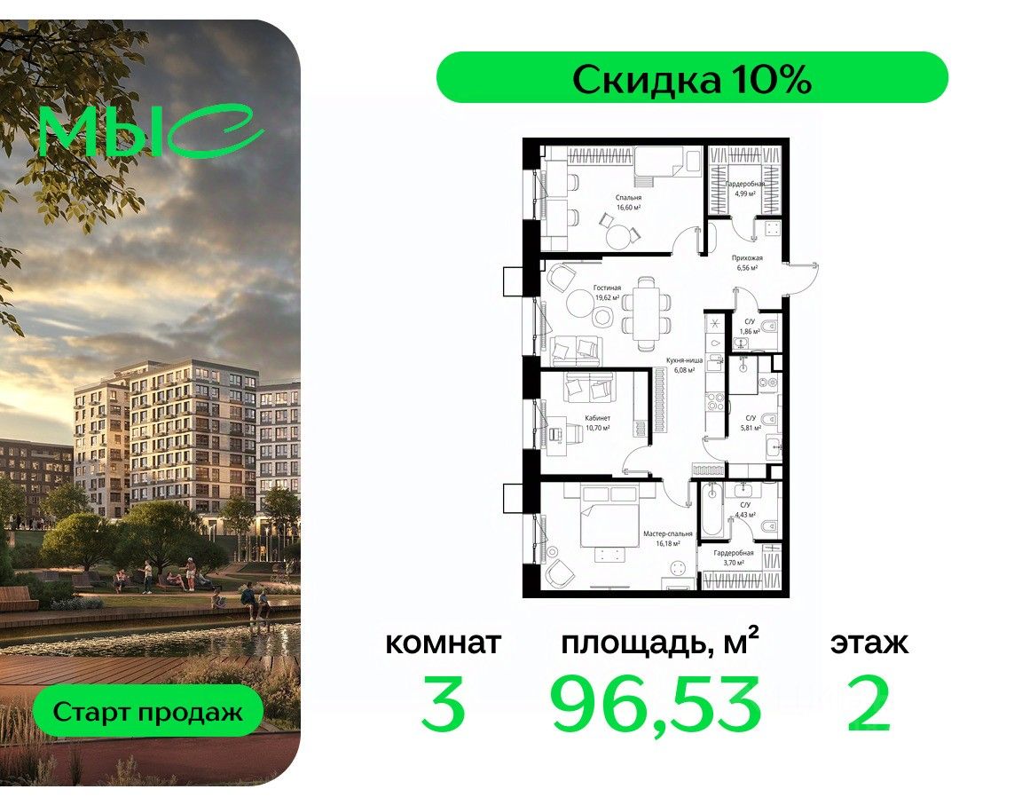 Продаётся 3-комнатная квартира общей площадью 96.53 м² без отделки в премиальном жилом комплексе "МЫС" на 2-м этаже 12 этажного дома. Квартира расположена в корпусе "Волга".