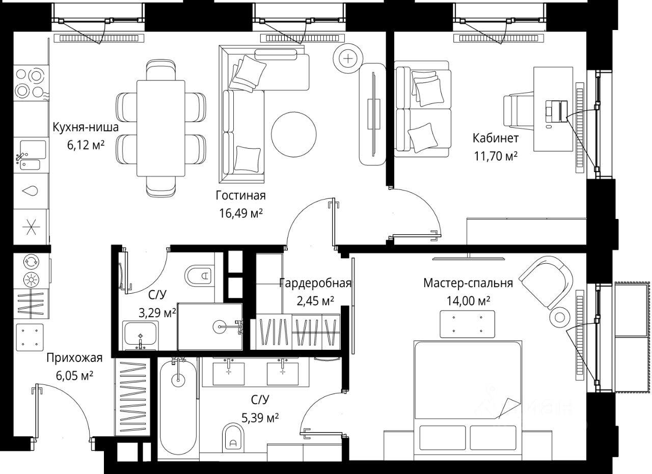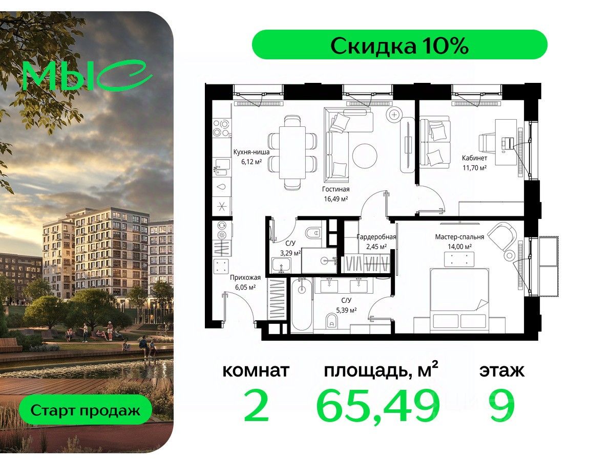 Продаётся 2-комнатная квартира общей площадью 65.49 м² без отделки в премиальном жилом комплексе "МЫС" на 9-м этаже 12 этажного дома. Квартира расположена в корпусе "Волга".
