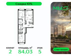 Продаётся 2-к квартира общей площадью 84.03 м² без отделки в премиальном жилом комплексе "МЫС" на 5-м этаже 12 этажного дома. Квартира расположена в корпусе "Волга".