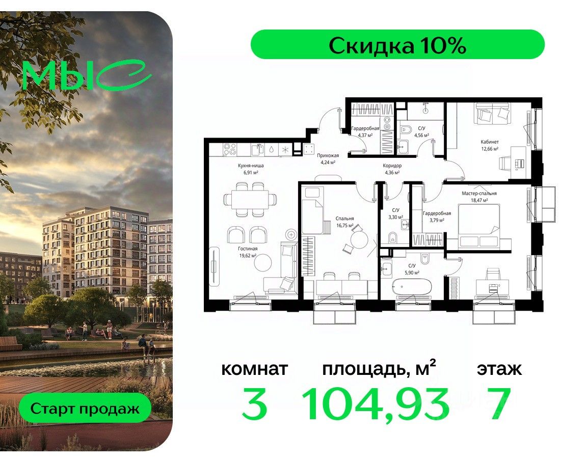 Продаётся 3-комнатная квартира общей площадью 104.93 м² без отделки в премиальном жилом комплексе "МЫС" на 7-м этаже 12 этажного дома. Квартира расположена в корпусе "Волга".