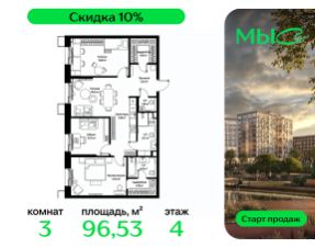 Продаётся 3-к квартира общей площадью 96.53 м² без отделки в премиальном жилом комплексе "МЫС" на 4-м этаже 12 этажного дома. Квартира расположена в корпусе "Волга".