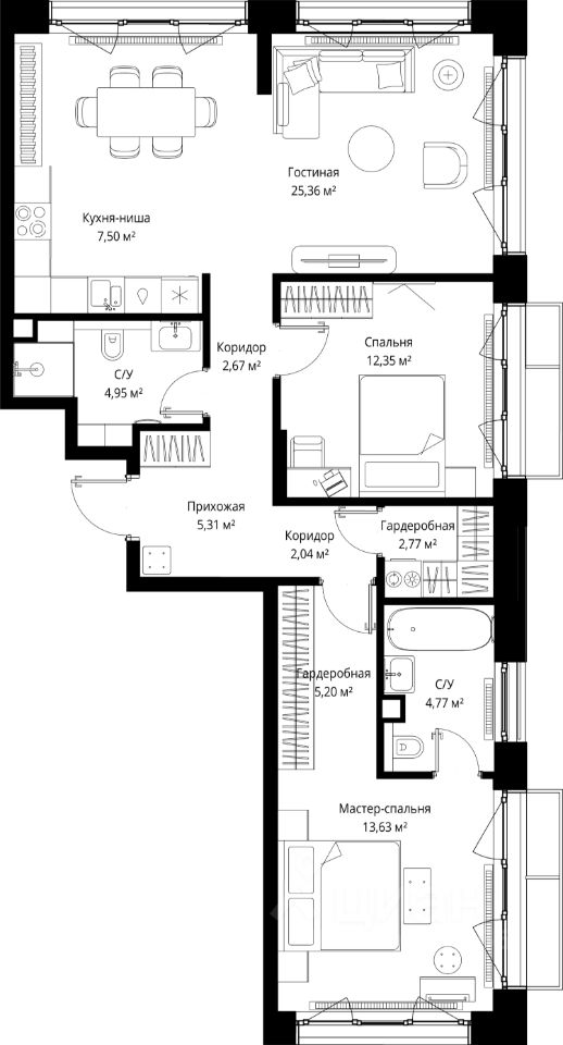 Продаётся 2-комнатная квартира общей площадью 86.55 м² без отделки в премиальном жилом комплексе "МЫС" на 8-м этаже 12 этажного дома. Квартира расположена в корпусе "Волга".