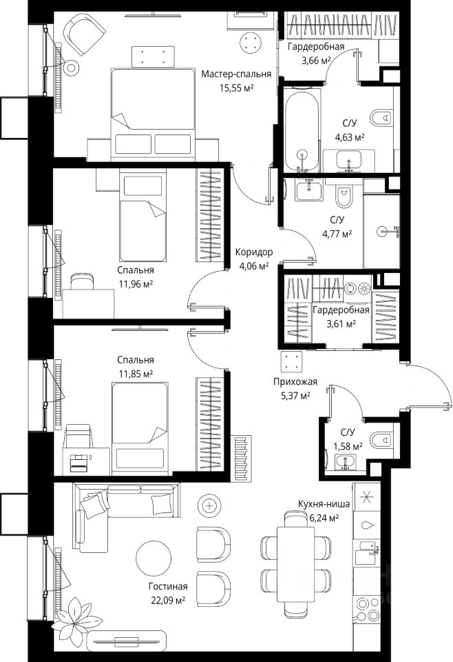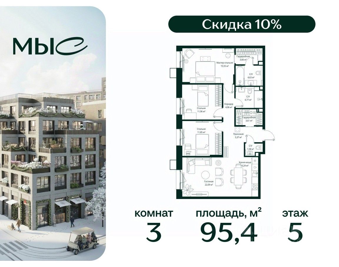 Продаётся 3-комнатная квартира общей площадью 95.37 м² без отделки в премиальном жилом комплексе "МЫС" на 5-м этаже 12 этажного дома. Квартира расположена в корпусе "Волга".
