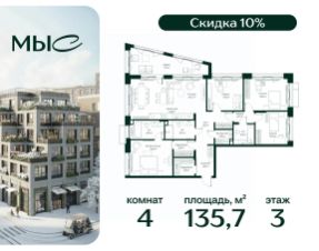 Продаётся 4-комнатная квартира общей площадью 135.71 м² без отделки в премиальном жилом комплексе "МЫС" на 3-м этаже 12 этажного дома. Квартира расположена в корпусе "Волга".