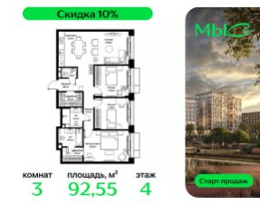 Продаётся 3-к квартира общей площадью 92.55 м² без отделки в премиальном жилом комплексе "МЫС" на 4-м этаже 12 этажного дома. Квартира расположена в корпусе "Волга".