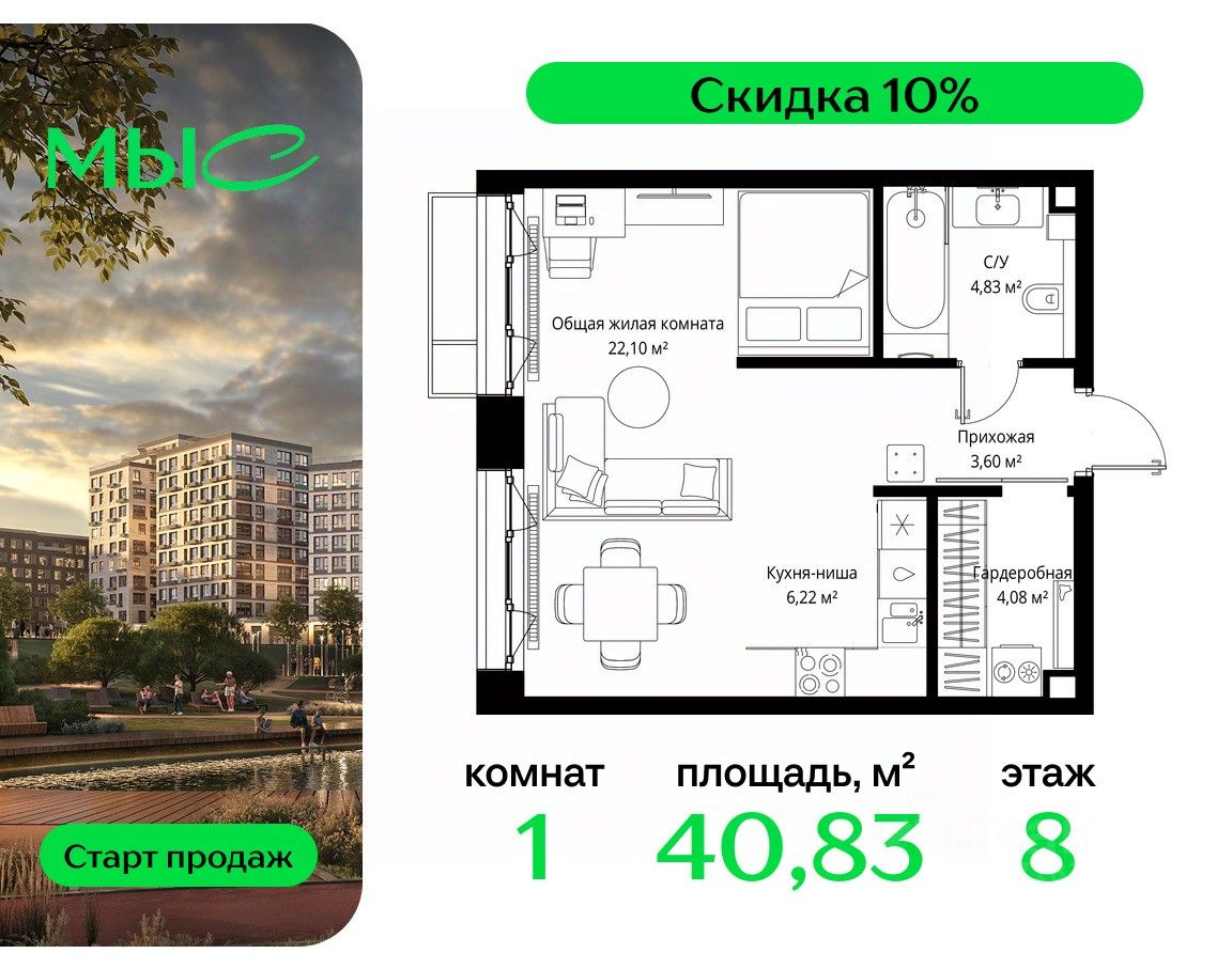 Продаётся 1-комнатная квартира общей площадью 40.83 м² без отделки в премиальном жилом комплексе "МЫС" на 8-м этаже 12 этажного дома. Квартира расположена в корпусе "Волга".