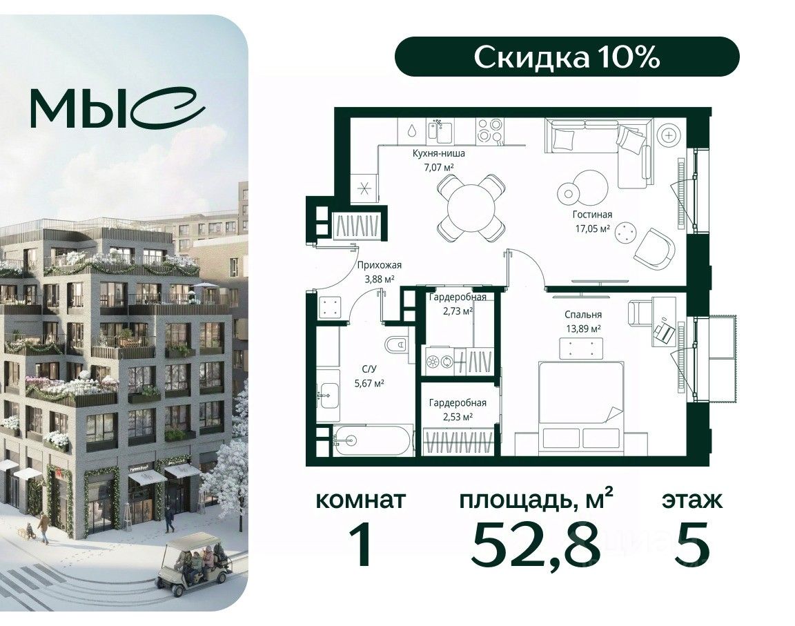 Продаётся 1-комнатная квартира общей площадью 52.82 м² без отделки в премиальном жилом комплексе "МЫС" на 5-м этаже 12 этажного дома. Квартира расположена в корпусе "Волга".