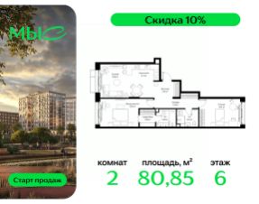 Продаётся 2-комнатная квартира общей площадью 80.85 м² без отделки в премиальном жилом комплексе "МЫС" на 6-м этаже 12 этажного дома. Квартира расположена в корпусе "Волга".
