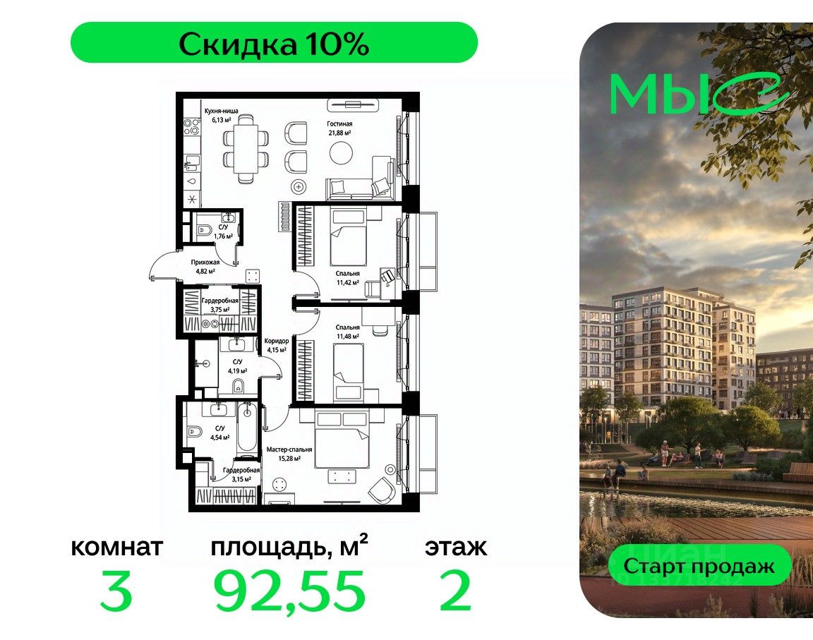 Продаётся 3-к квартира общей площадью 92.55 м² без отделки в премиальном жилом комплексе "МЫС" на 2-м этаже 12 этажного дома. Квартира расположена в корпусе "Волга".