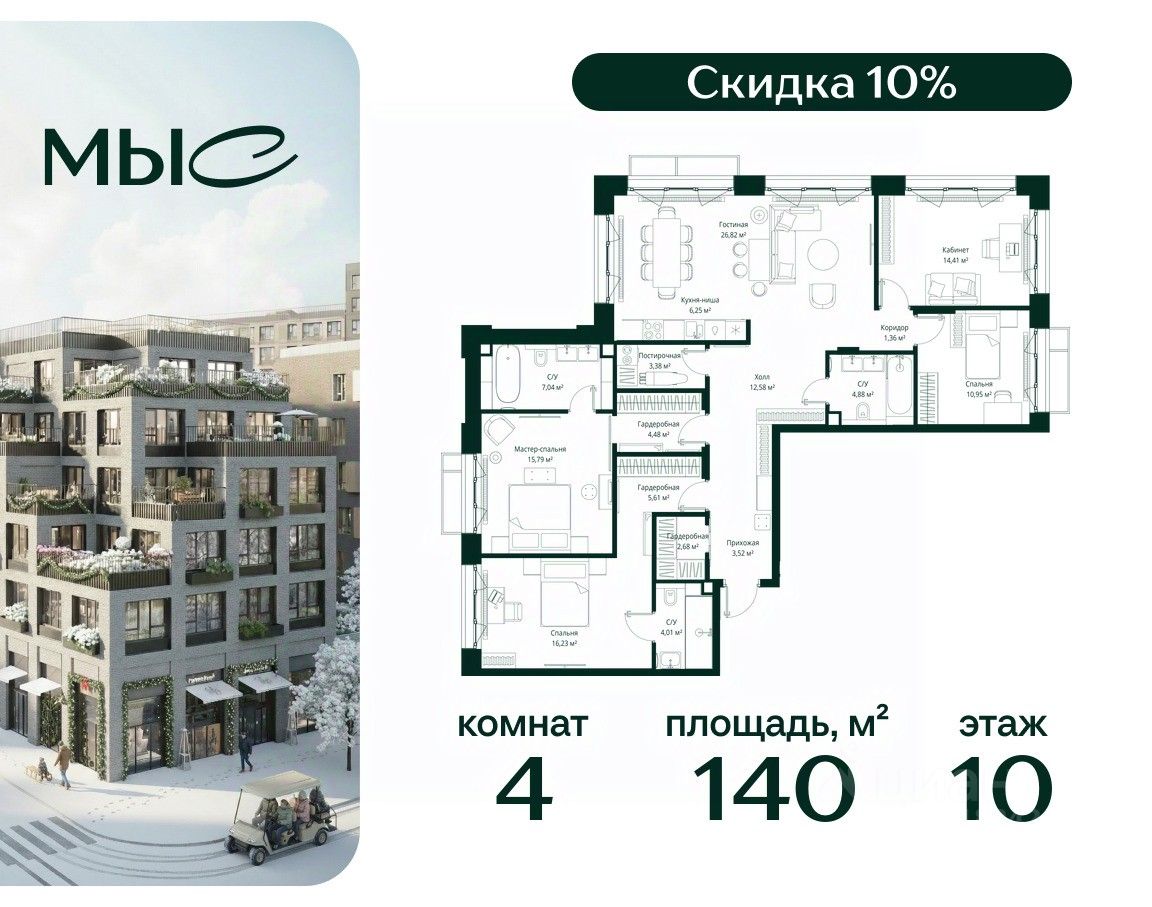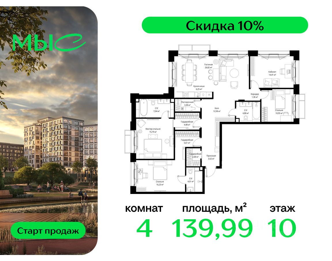 Продаётся 4-комнатная квартира общей площадью 139.99 м² без отделки в премиальном жилом комплексе "МЫС" на 10-м этаже 12 этажного дома. Квартира расположена в корпусе "Волга".