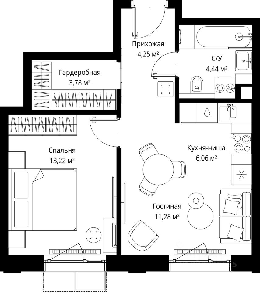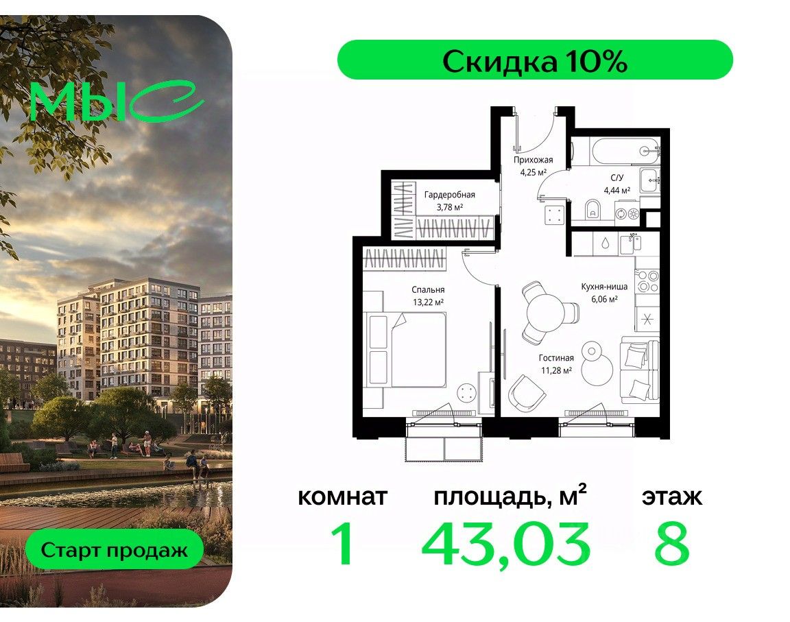 Продаётся 1-комнатная квартира общей площадью 43.03 м² без отделки в премиальном жилом комплексе "МЫС" на 8-м этаже 12 этажного дома. Квартира расположена в корпусе "Волга".