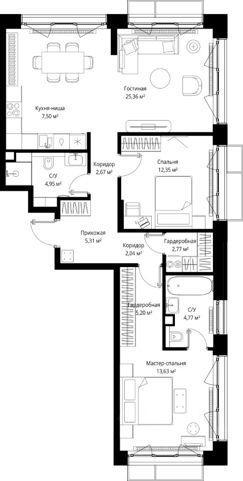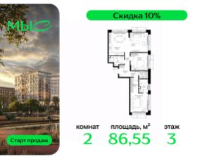 Продаётся 2-комнатная квартира общей площадью 86.55 м² без отделки в премиальном жилом комплексе "МЫС" на 3-м этаже 12 этажного дома. Квартира расположена в корпусе "Волга".