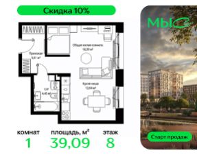 Продаётся 1-к квартира общей площадью 39.09 м² без отделки в премиальном жилом комплексе "МЫС" на 8-м этаже 12 этажного дома. Квартира расположена в корпусе "Волга".