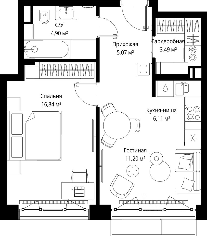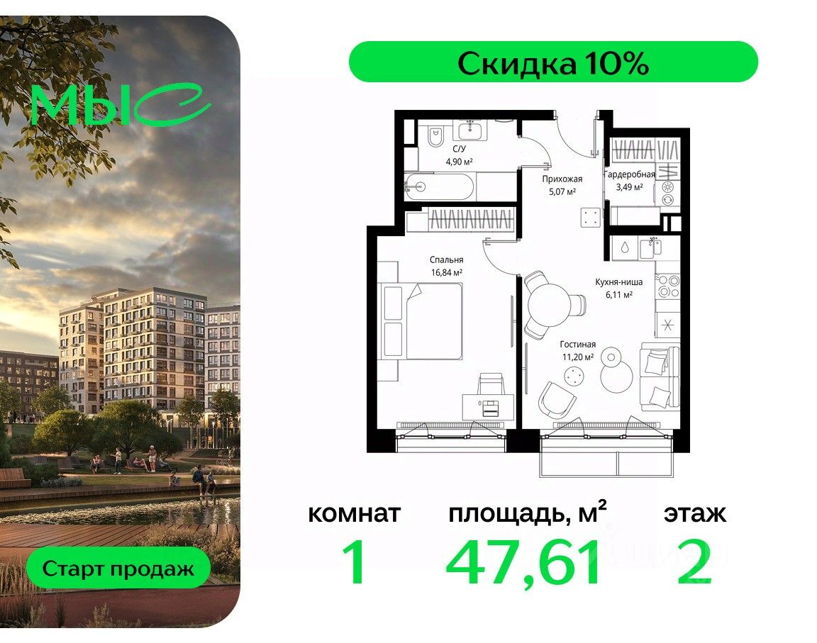 Продаётся 1-комнатная квартира общей площадью 47.61 м² без отделки в премиальном жилом комплексе "МЫС" на 2-м этаже 12 этажного дома. Квартира расположена в корпусе "Волга".