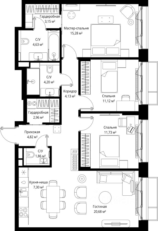 Продаётся 3-комнатная квартира общей площадью 91.86 м² без отделки в премиальном жилом комплексе "МЫС" на 8-м этаже 12 этажного дома. Квартира расположена в корпусе "Волга".