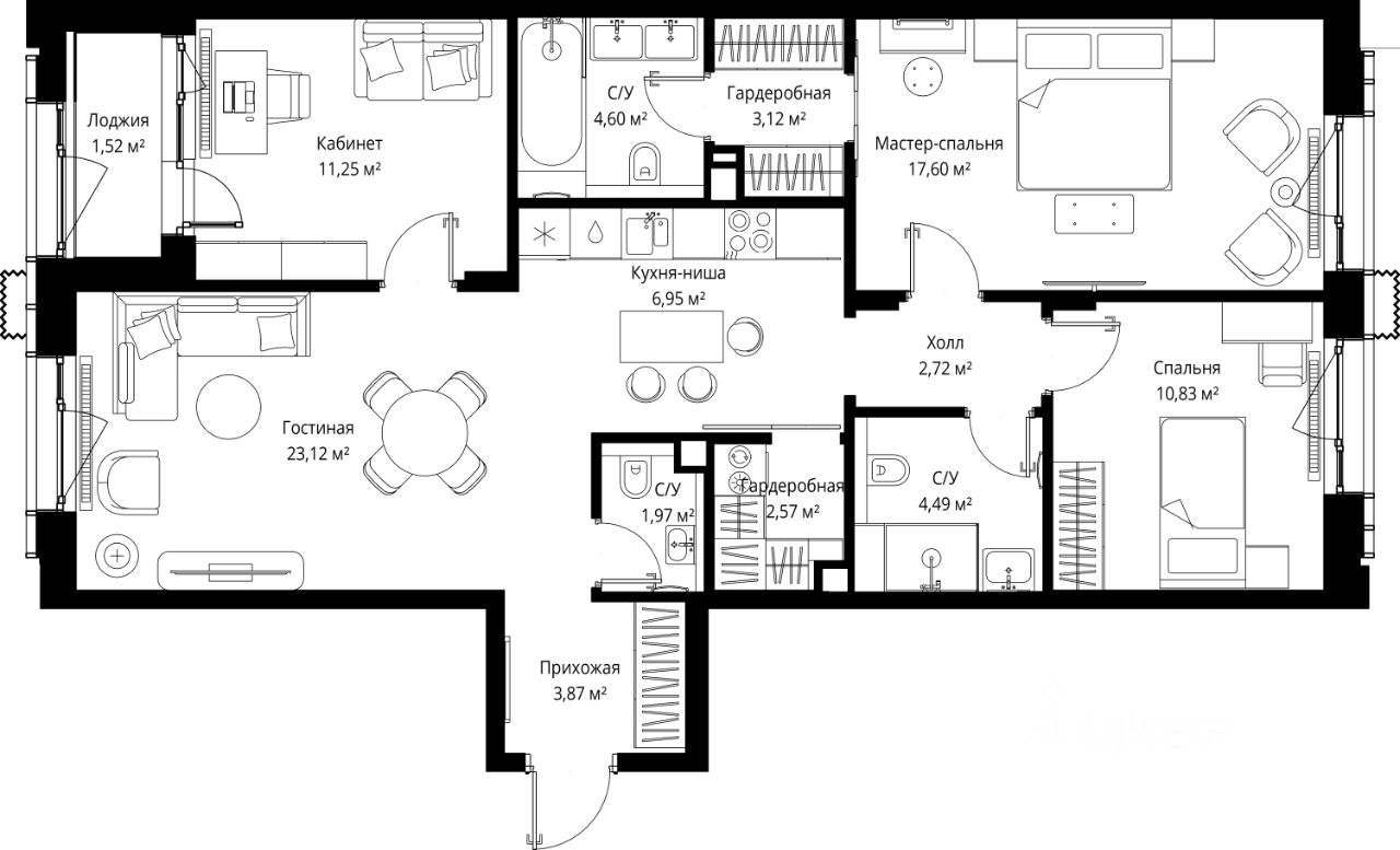 Продаётся 3-комнатная квартира общей площадью 94.61 м² без отделки в премиальном жилом комплексе "МЫС" на 4-м этаже 12 этажного дома. Квартира расположена в корпусе "Волга".
