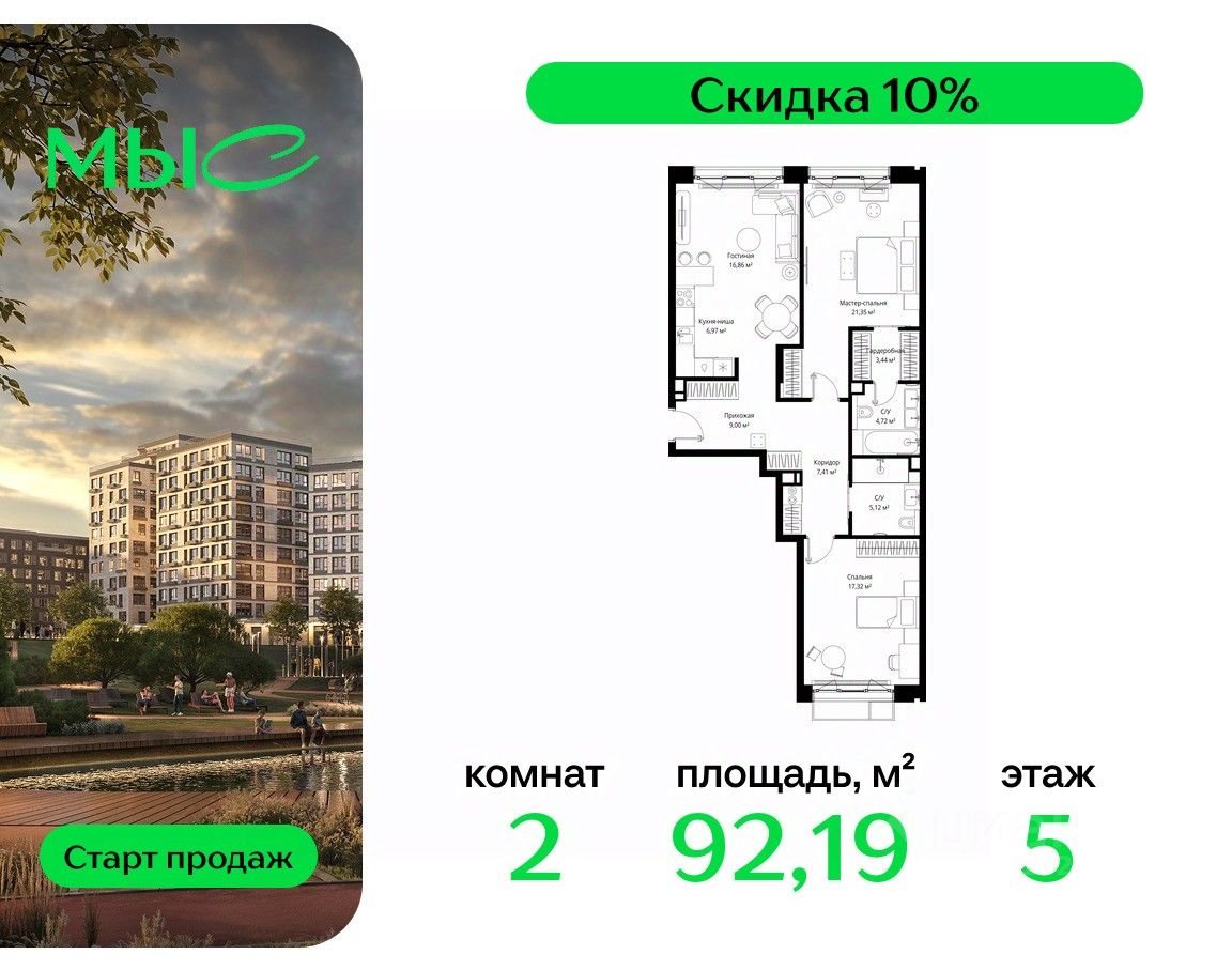 Продаётся 2-комнатная квартира общей площадью 92.19 м² без отделки в премиальном жилом комплексе "МЫС" на 5-м этаже 12 этажного дома. Квартира расположена в корпусе "Волга".