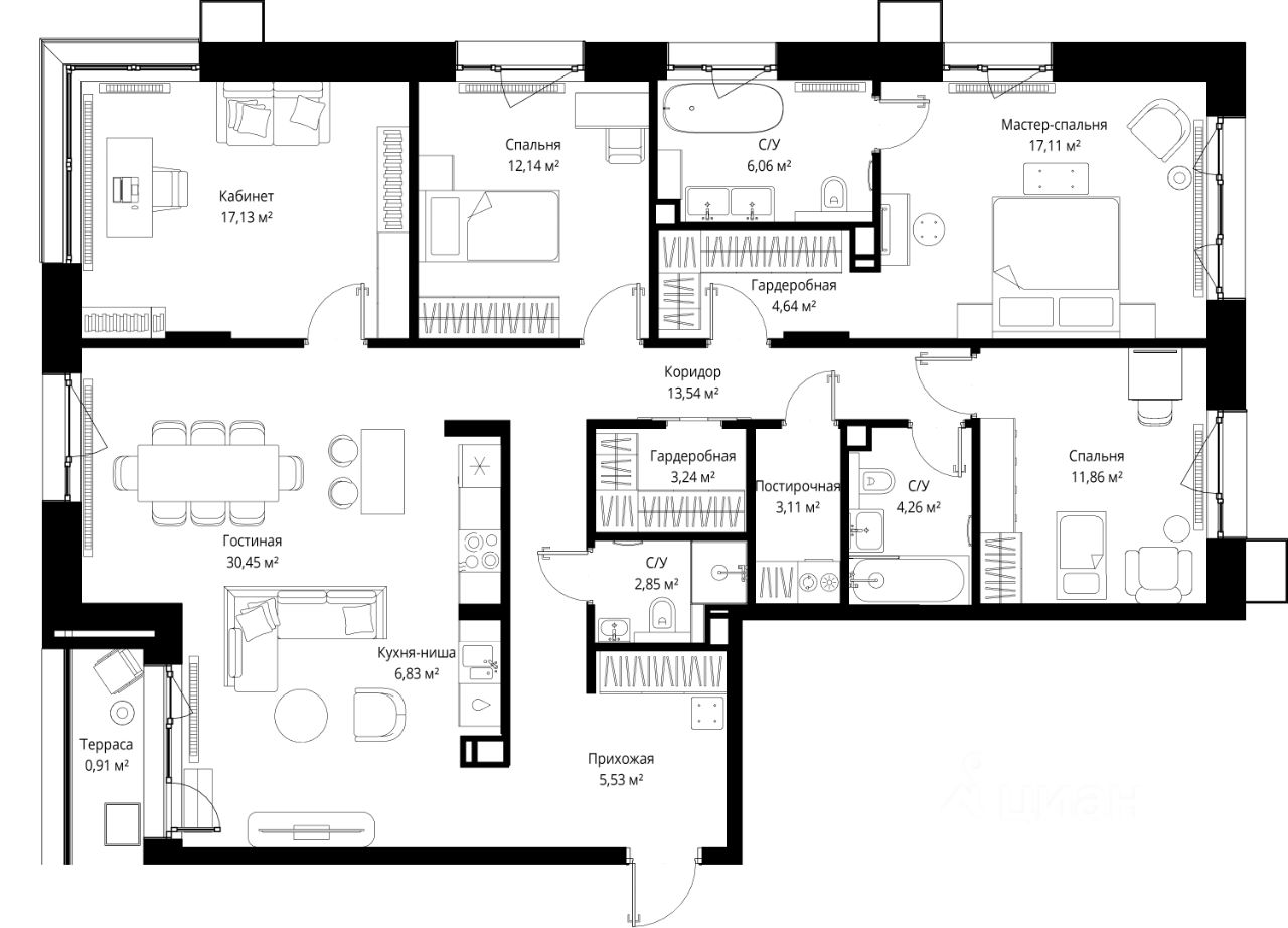 Продаётся 4-комнатная квартира общей площадью 139.66 м² без отделки в премиальном жилом комплексе "МЫС" на 6-м этаже 12 этажного дома. Квартира расположена в корпусе "Волга".