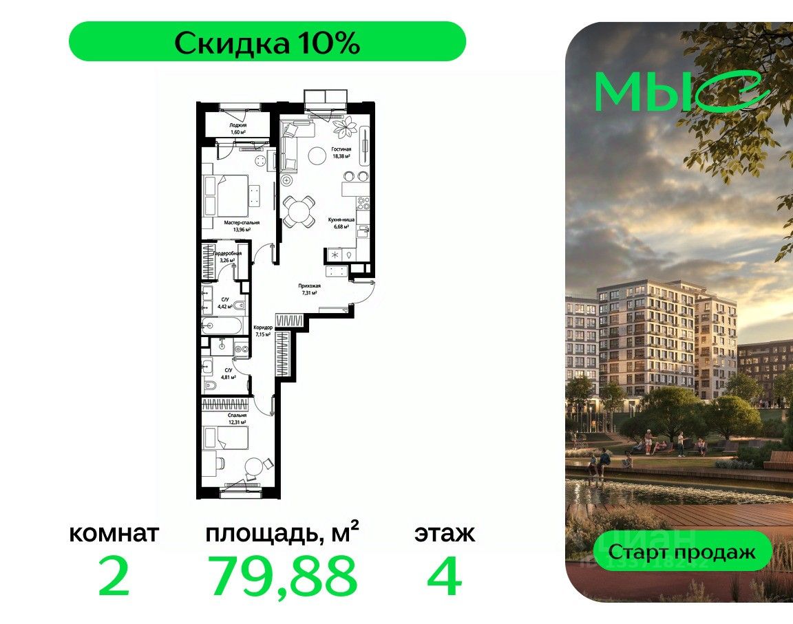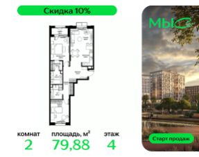 Продаётся 2-к квартира общей площадью 79.88 м² без отделки в премиальном жилом комплексе "МЫС" на 4-м этаже 12 этажного дома. Квартира расположена в корпусе "Волга".
