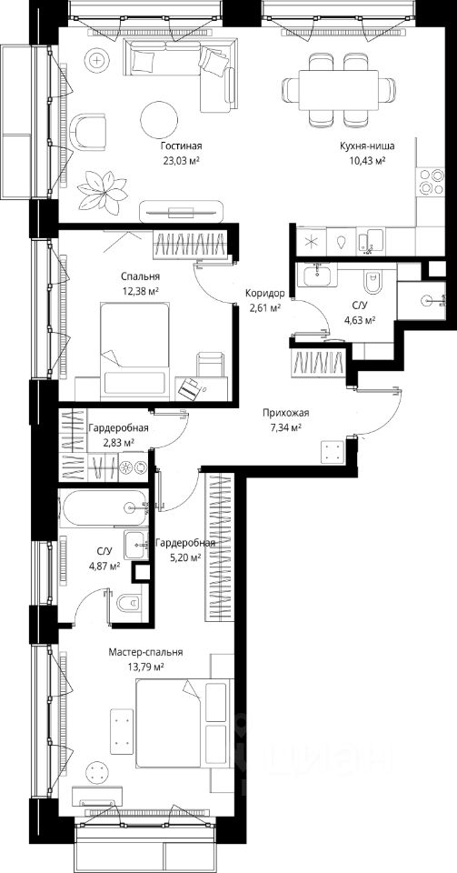 Продаётся 2-комнатная квартира общей площадью 87.11 м² без отделки в премиальном жилом комплексе "МЫС" на 5-м этаже 12 этажного дома. Квартира расположена в корпусе "Волга".