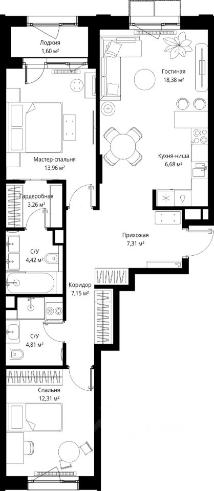 Продаётся 2-комнатная квартира общей площадью 79.88 м² без отделки в премиальном жилом комплексе "МЫС" на 6-м этаже 12 этажного дома. Квартира расположена в корпусе "Волга".