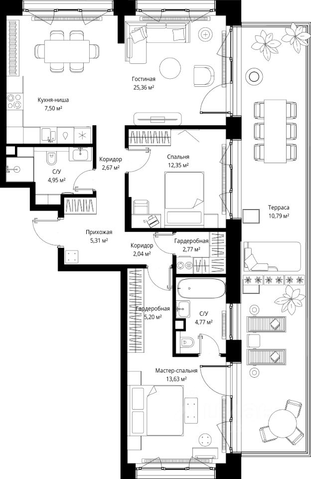 Продаётся 2-комнатная квартира общей площадью 97.34 м² без отделки в премиальном жилом комплексе "МЫС" на 2-м этаже 12 этажного дома. Квартира расположена в корпусе "Волга".