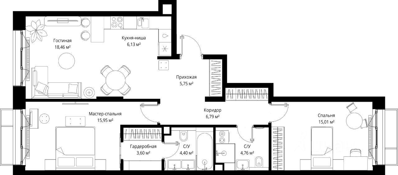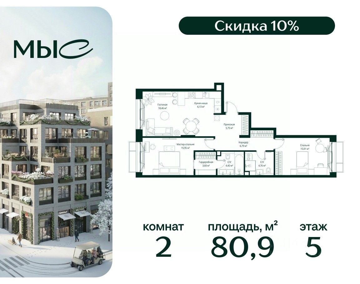Продаётся 2-комнатная квартира общей площадью 80.85 м² без отделки в премиальном жилом комплексе "МЫС" на 5-м этаже 12 этажного дома. Квартира расположена в корпусе "Волга".