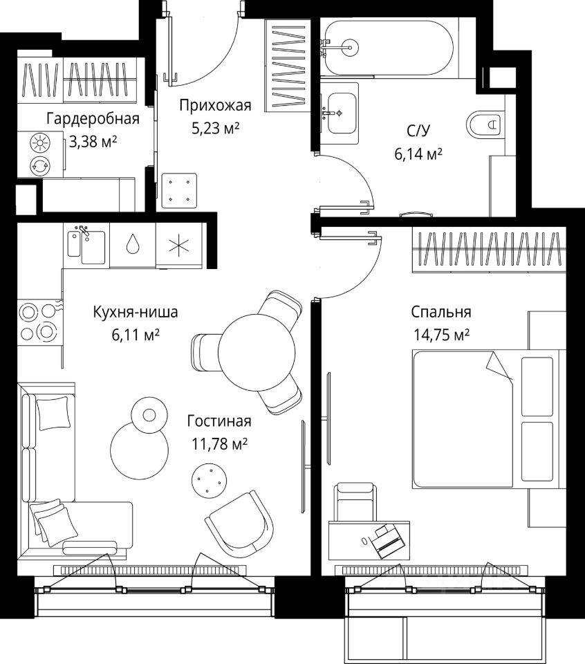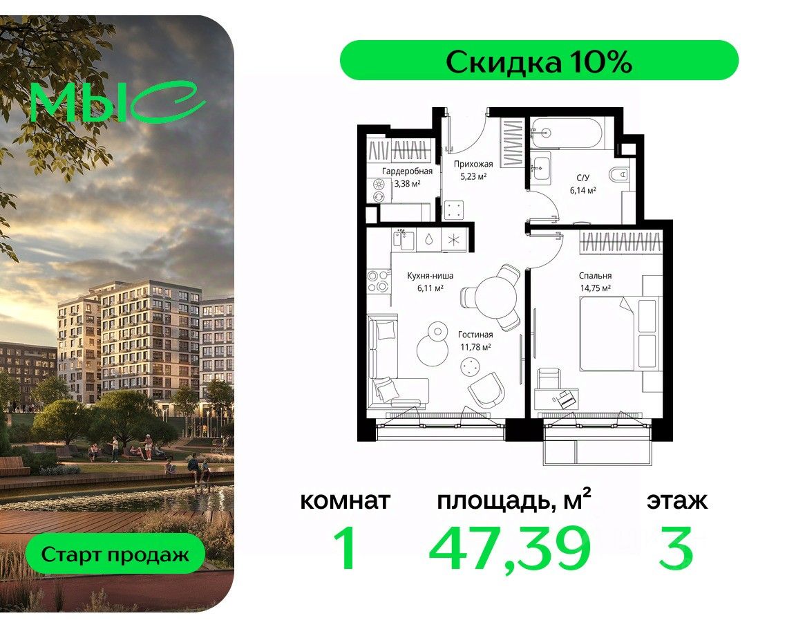 Продаётся 1-комнатная квартира общей площадью 47.39 м² без отделки в премиальном жилом комплексе "МЫС" на 3-м этаже 12 этажного дома. Квартира расположена в корпусе "Волга".