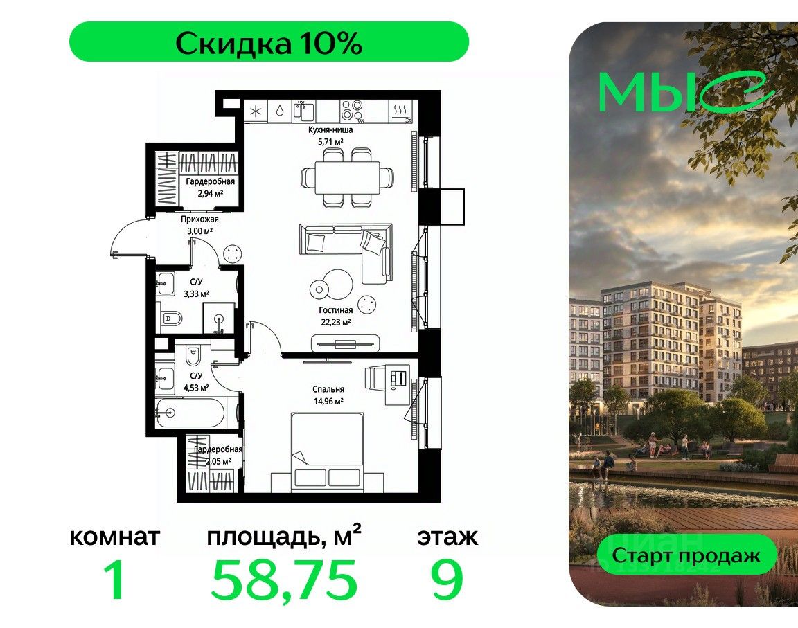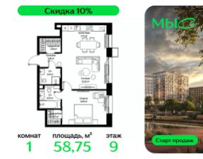 Продаётся 1-к квартира общей площадью 58.75 м² без отделки в премиальном жилом комплексе "МЫС" на 9-м этаже 12 этажного дома. Квартира расположена в корпусе "Волга".