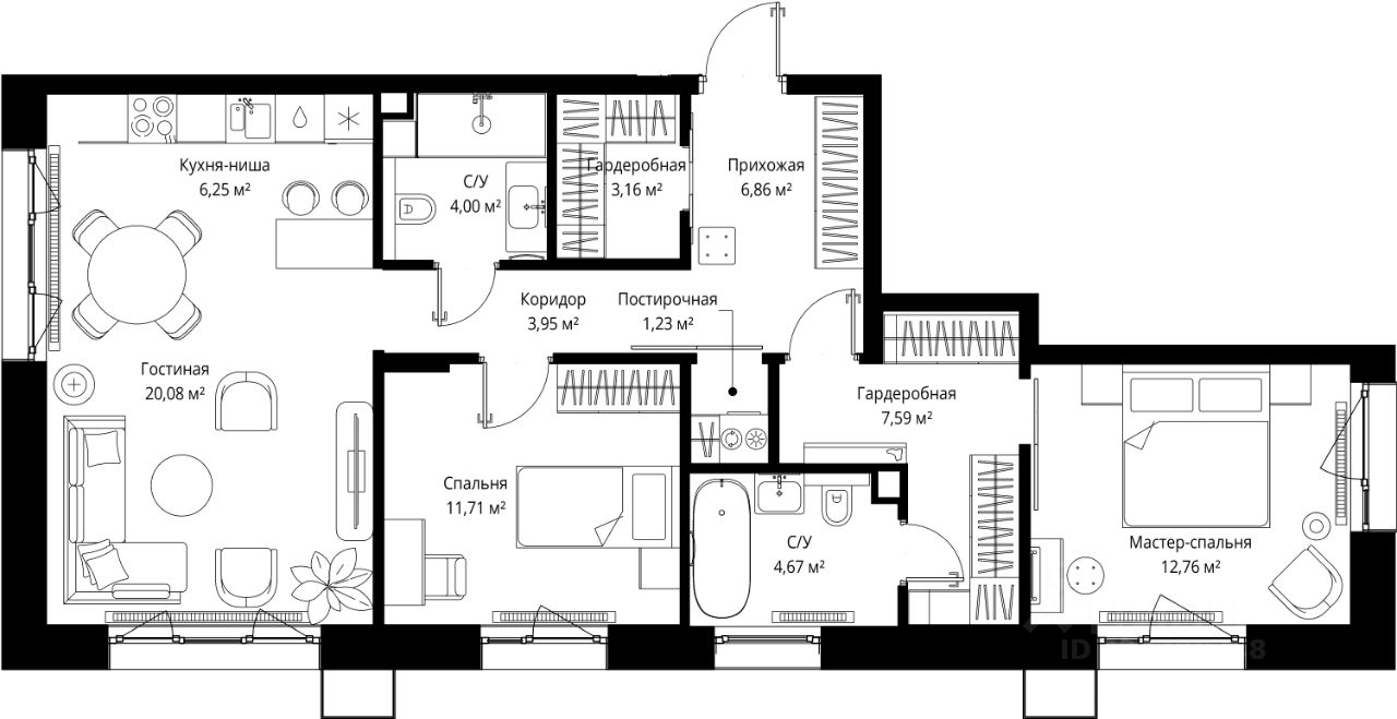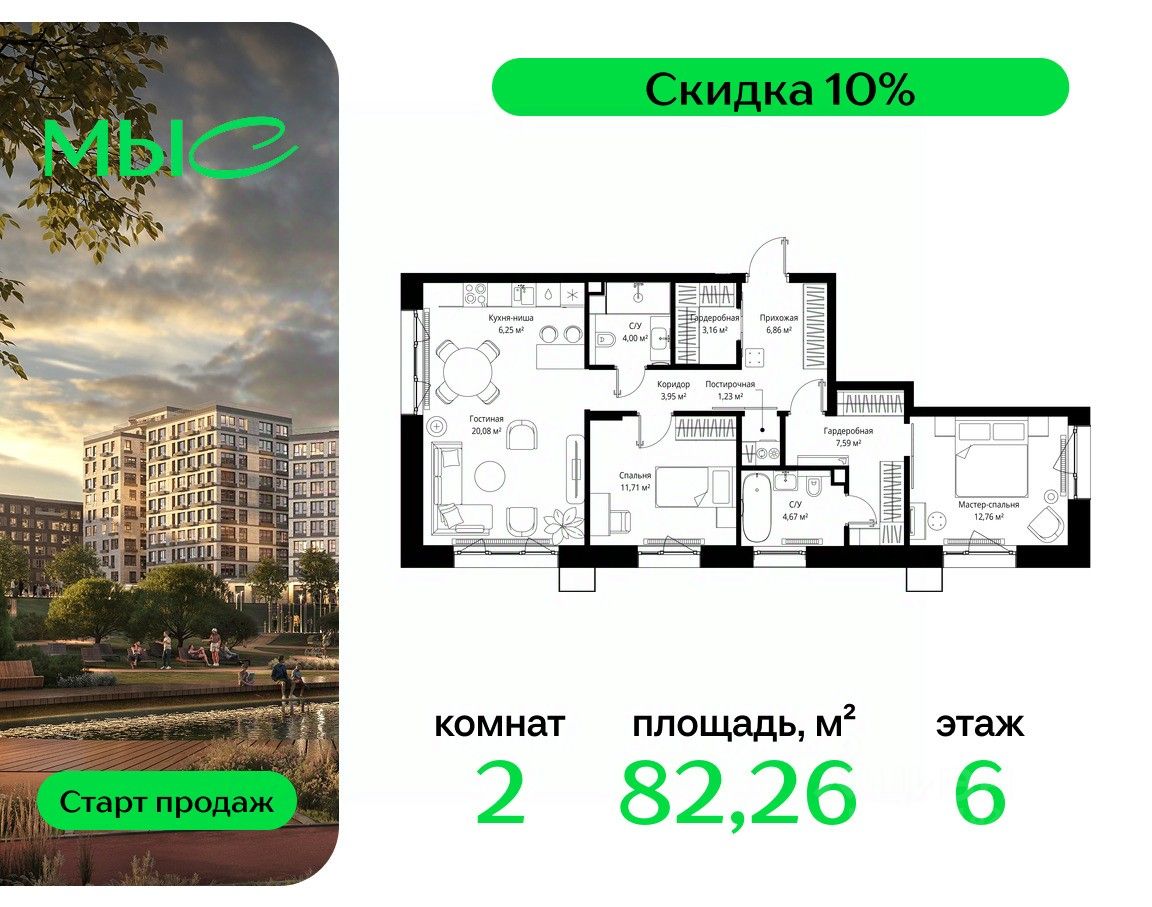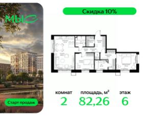 Продаётся 2-комнатная квартира общей площадью 82.26 м² без отделки в премиальном жилом комплексе "МЫС" на 6-м этаже 12 этажного дома. Квартира расположена в корпусе "Волга".