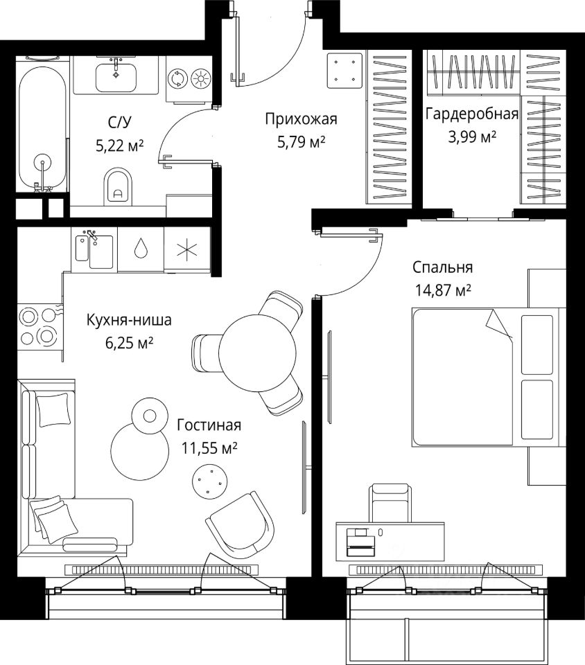 Продаётся 1-комнатная квартира общей площадью 47.67 м² без отделки в премиальном жилом комплексе "МЫС" на 7-м этаже 12 этажного дома. Квартира расположена в корпусе "Волга".