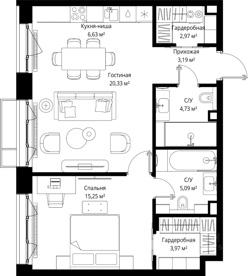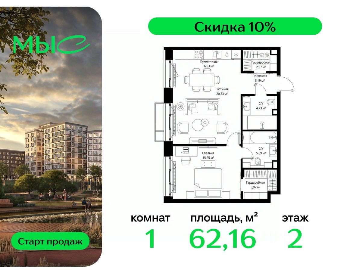 Продаётся 1-комнатная квартира общей площадью 62.16 м² без отделки в премиальном жилом комплексе "МЫС" на 2-м этаже 12 этажного дома. Квартира расположена в корпусе "Волга".