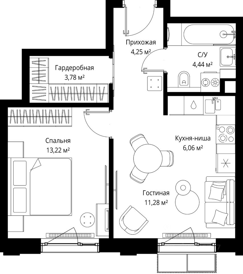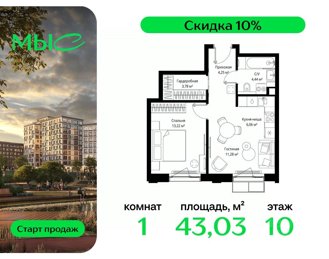 Продаётся 1-комнатная квартира общей площадью 43.03 м² без отделки в премиальном жилом комплексе "МЫС" на 10-м этаже 12 этажного дома. Квартира расположена в корпусе "Волга".