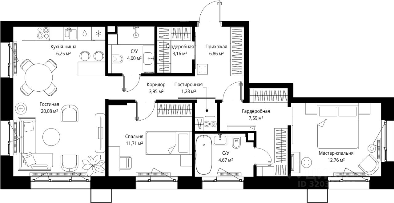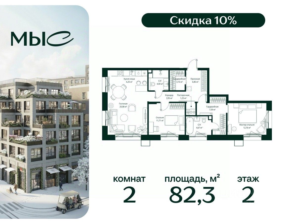 Продаётся 2-комнатная квартира общей площадью 82.26 м² без отделки в премиальном жилом комплексе "МЫС" на 2-м этаже 12 этажного дома. Квартира расположена в корпусе "Волга".