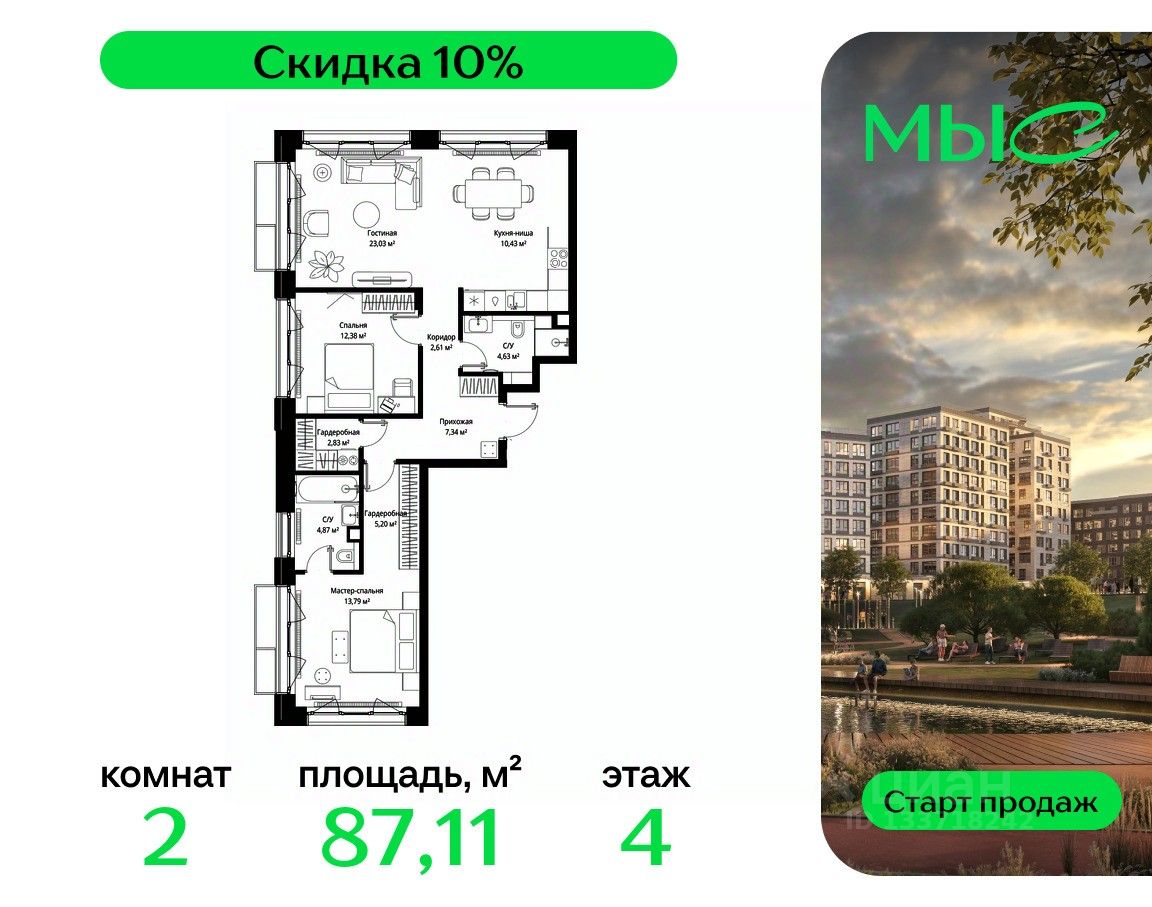 Продаётся 2-к квартира общей площадью 87.11 м² без отделки в премиальном жилом комплексе "МЫС" на 4-м этаже 12 этажного дома. Квартира расположена в корпусе "Волга".