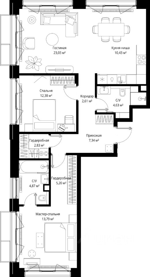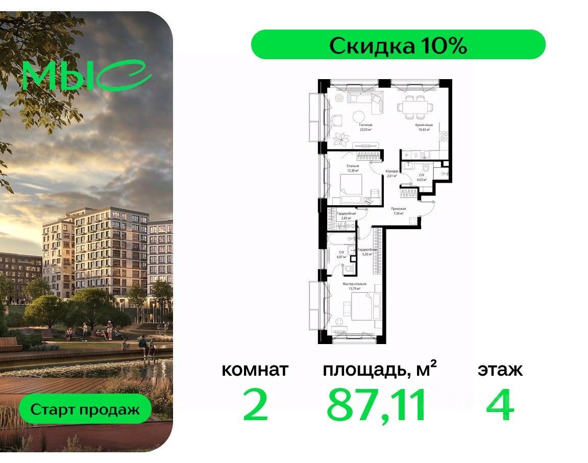 Продаётся 2-комнатная квартира общей площадью 87.11 м² без отделки в премиальном жилом комплексе "МЫС" на 4-м этаже 12 этажного дома. Квартира расположена в корпусе "Волга".