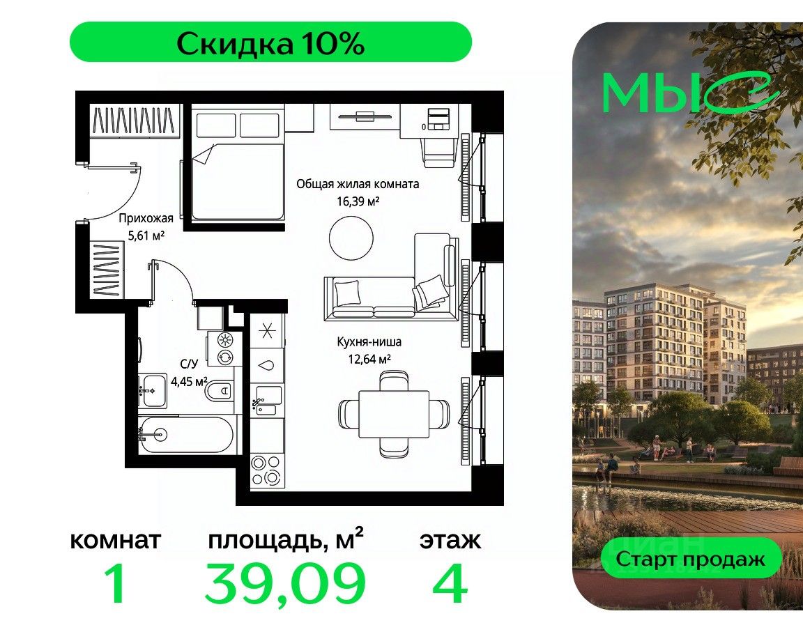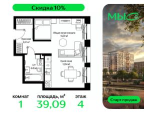Продаётся 1-к квартира общей площадью 39.09 м² без отделки в премиальном жилом комплексе "МЫС" на 4-м этаже 12 этажного дома. Квартира расположена в корпусе "Волга".