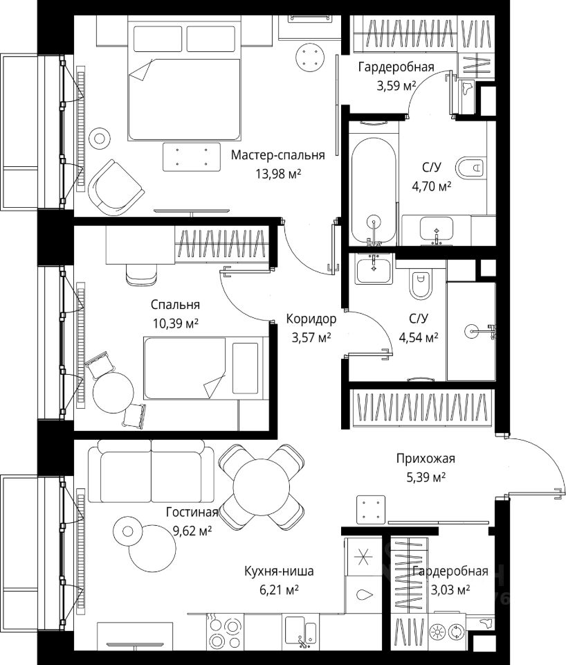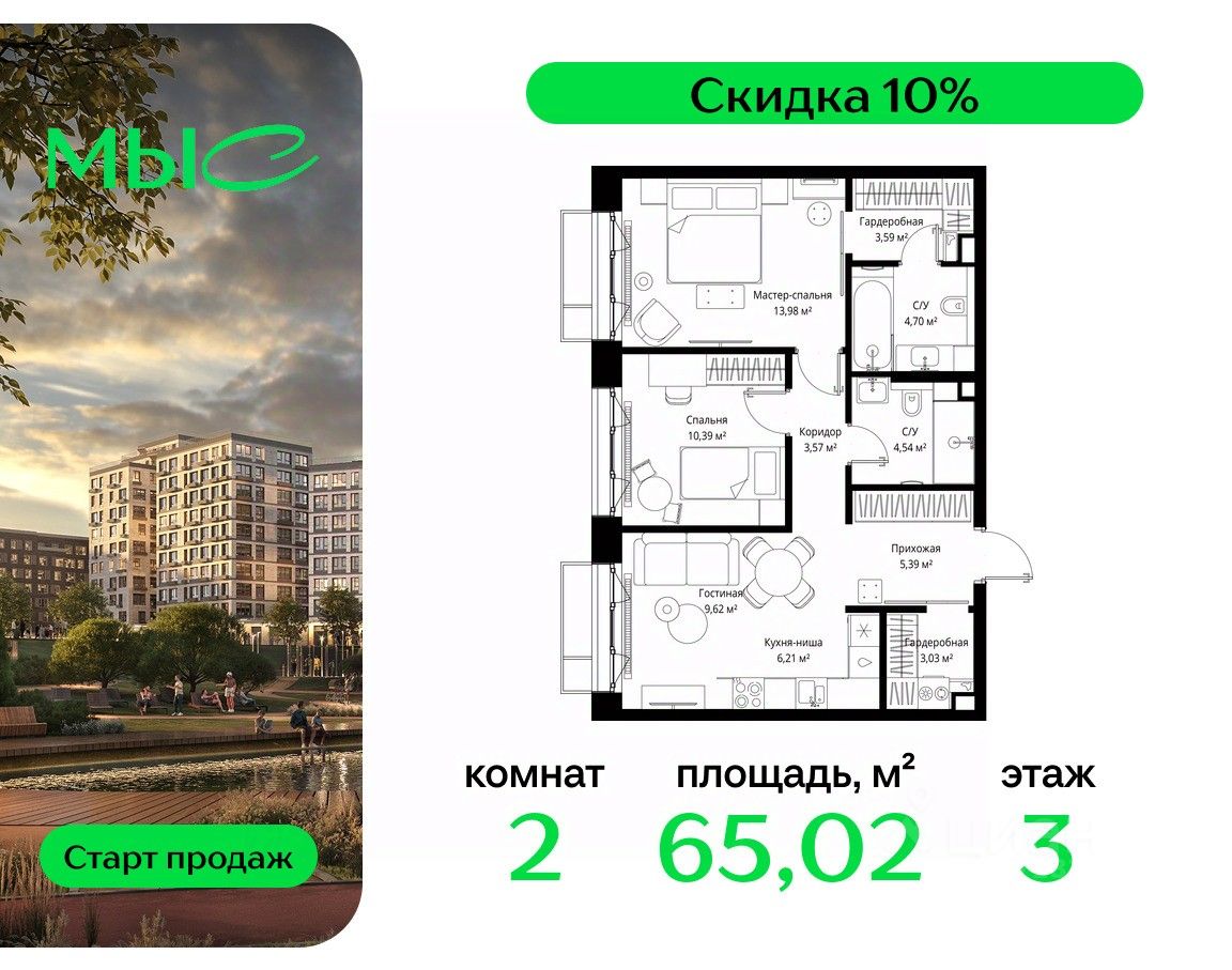 Продаётся 2-комнатная квартира общей площадью 65.02 м² без отделки в премиальном жилом комплексе "МЫС" на 3-м этаже 12 этажного дома. Квартира расположена в корпусе "Волга".
