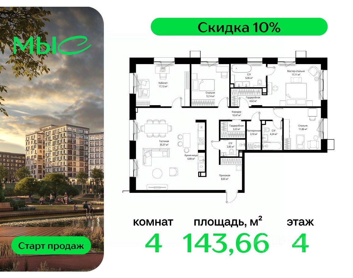 Продаётся 4-комнатная квартира общей площадью 143.66 м² без отделки в премиальном жилом комплексе "МЫС" на 4-м этаже 12 этажного дома. Квартира расположена в корпусе "Волга".