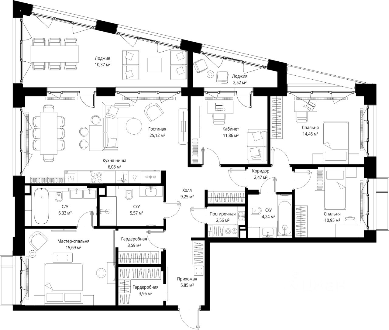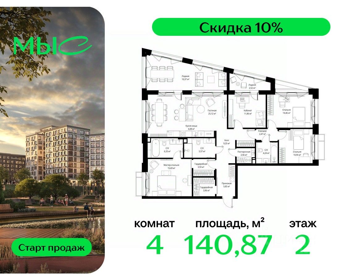 Продаётся 4-комнатная квартира общей площадью 140.87 м² без отделки в премиальном жилом комплексе "МЫС" на 2-м этаже 12 этажного дома. Квартира расположена в корпусе "Волга".