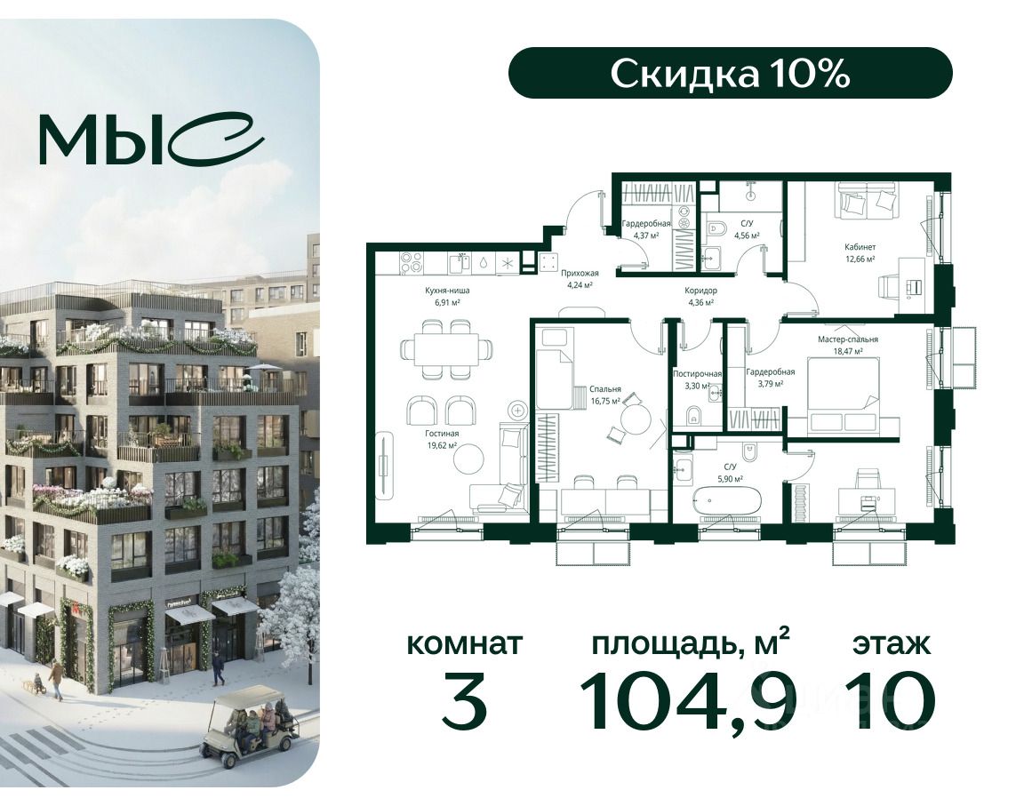 Продаётся 3-комнатная квартира общей площадью 104.93 м² без отделки в премиальном жилом комплексе "МЫС" на 10-м этаже 12 этажного дома. Квартира расположена в корпусе "Волга".