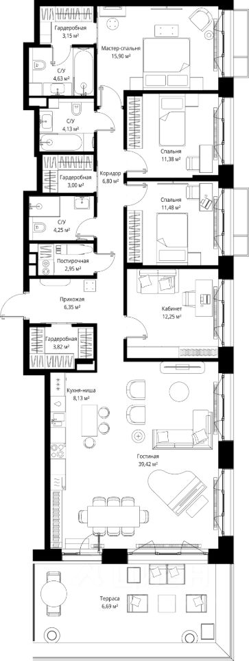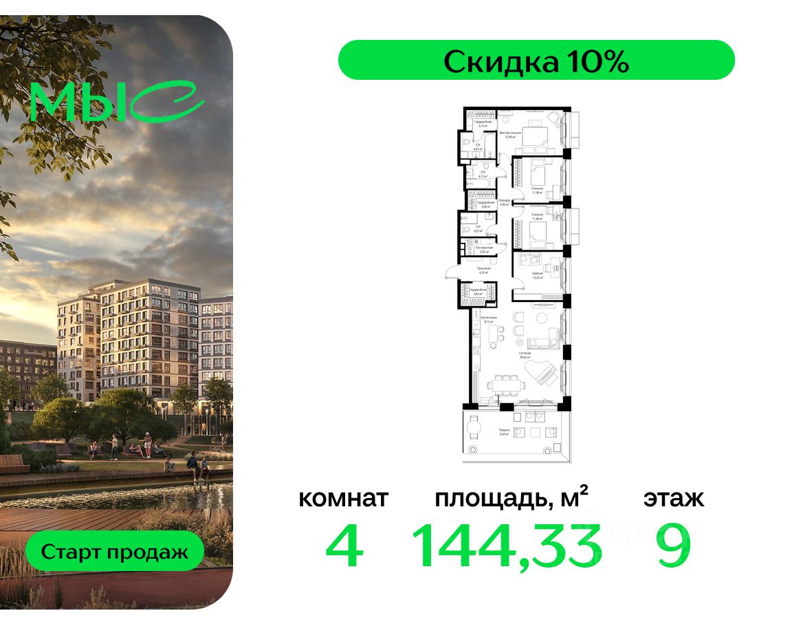 Продаётся 4-комнатная квартира общей площадью 144.33 м² без отделки в премиальном жилом комплексе "МЫС" на 9-м этаже 12 этажного дома. Квартира расположена в корпусе "Волга".