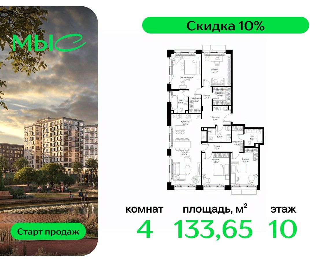 Продаётся 4-комнатная квартира общей площадью 133.65 м² без отделки в премиальном жилом комплексе "МЫС" на 10-м этаже 12 этажного дома. Квартира расположена в корпусе "Волга".
