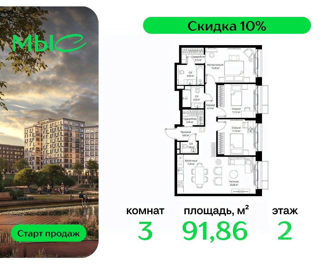 Продаётся 3-комнатная квартира общей площадью 91.86 м² без отделки в премиальном жилом комплексе "МЫС" на 2-м этаже 12 этажного дома. Квартира расположена в корпусе "Волга".